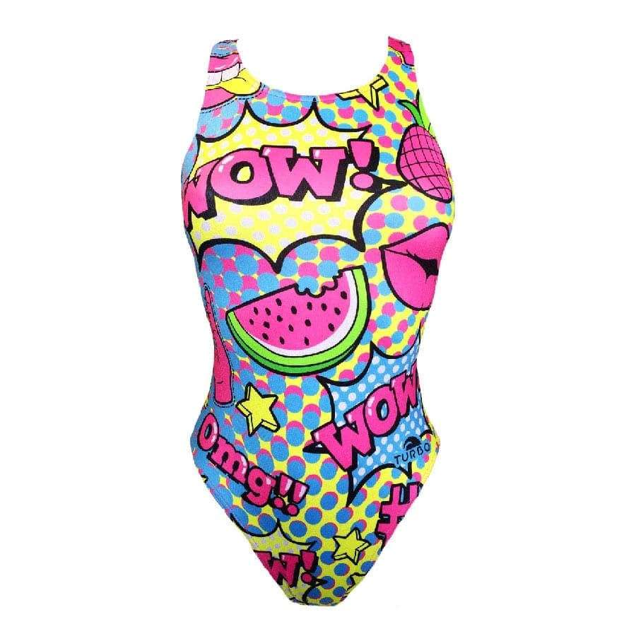 Der Badeanzug Turbo Cool Comic breite Träger für Damen bietet eine bequeme Passform und wurde aus chlorresistentem Stoff gefertigt, sodass Sie ihn Tag für Tag tragen können, ohne die Lebendigkeit des Stoffes zu beeinträchtigen. Die breiten Träger bieten Bewegungsfreiheit und eine besseren Halt.