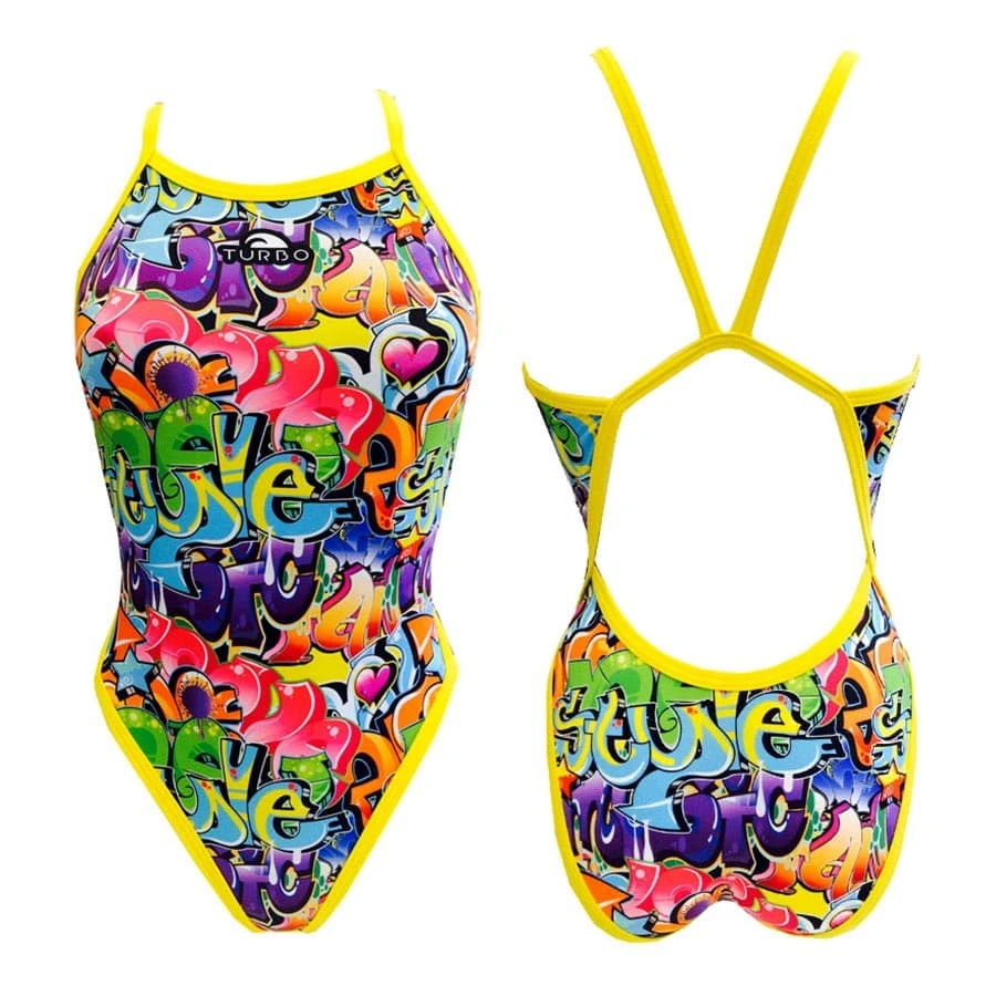 Der Turbo Graffitti Badeanzug für Damen hat einen enganliegenden Schnitt und besteht aus einem sehr elastischen und chlorresistenten Gewebe, um in jeden Tag tragen zu können, ohne dass er die lebhafte Farbe und die Passform verliert. Dank der dünnen und flachen Träger können Sie sich frei bewegen und den Bereich der Sonneneinstrahlung vergrößern.